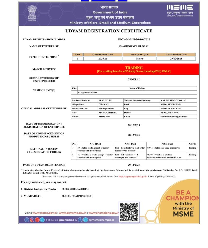 SS Agrowave Global was founded with a clear vision: to connect Indian farmers and processors with global markets through quality-driven, ethical, and sustainable trade practices. India is one of the world’s largest producers of onions, jaggery, spices, and fresh vegetables, and our mission is to showcase this strength to the world. Operating from Chakan, Pune—a rapidly growing industrial and logistics hub—we are strategically positioned to manage procurement, processing, quality control, packaging, and exports efficiently. Our operations are guided by strict quality benchmarks, international compliance standards, and a customer-first approach.